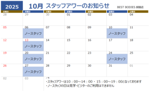 10月の毎週月曜日、第2、第4金曜日はノースタッフとなります。